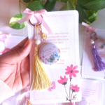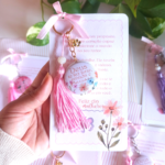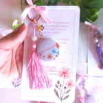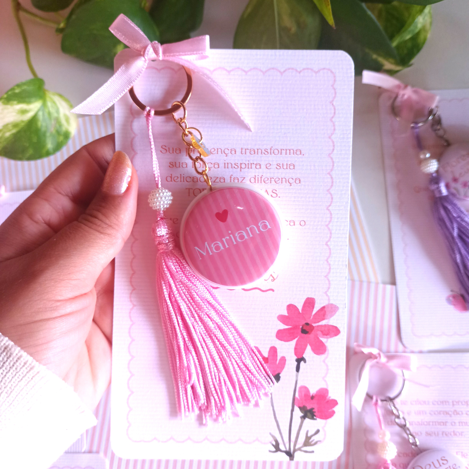 Os cards vão combinando com o chaveiro e você pode escolher o que deseja escrito.