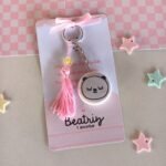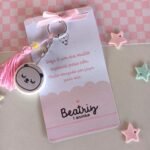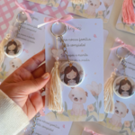 Os cards vão combinando com o chaveiro e você pode escolher o que deseja escrito.