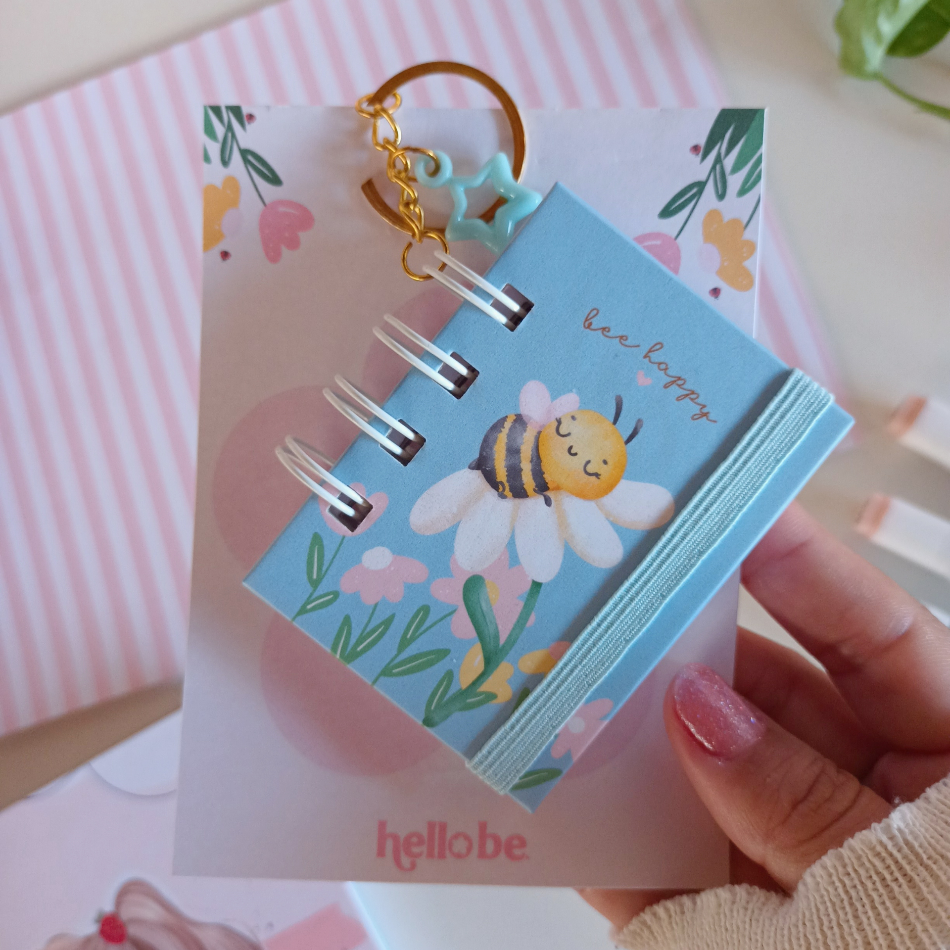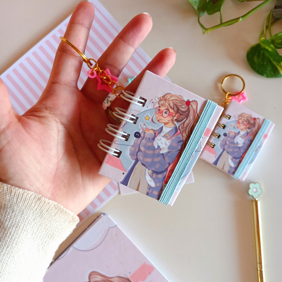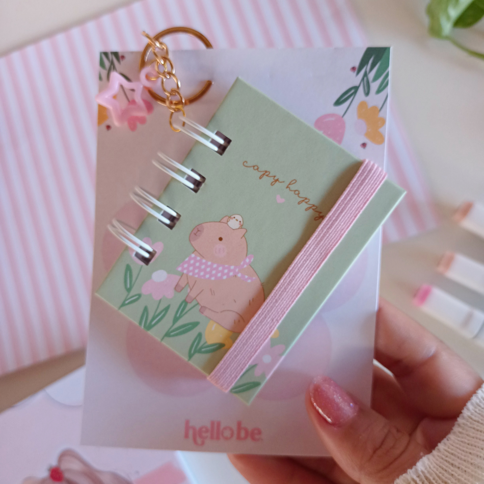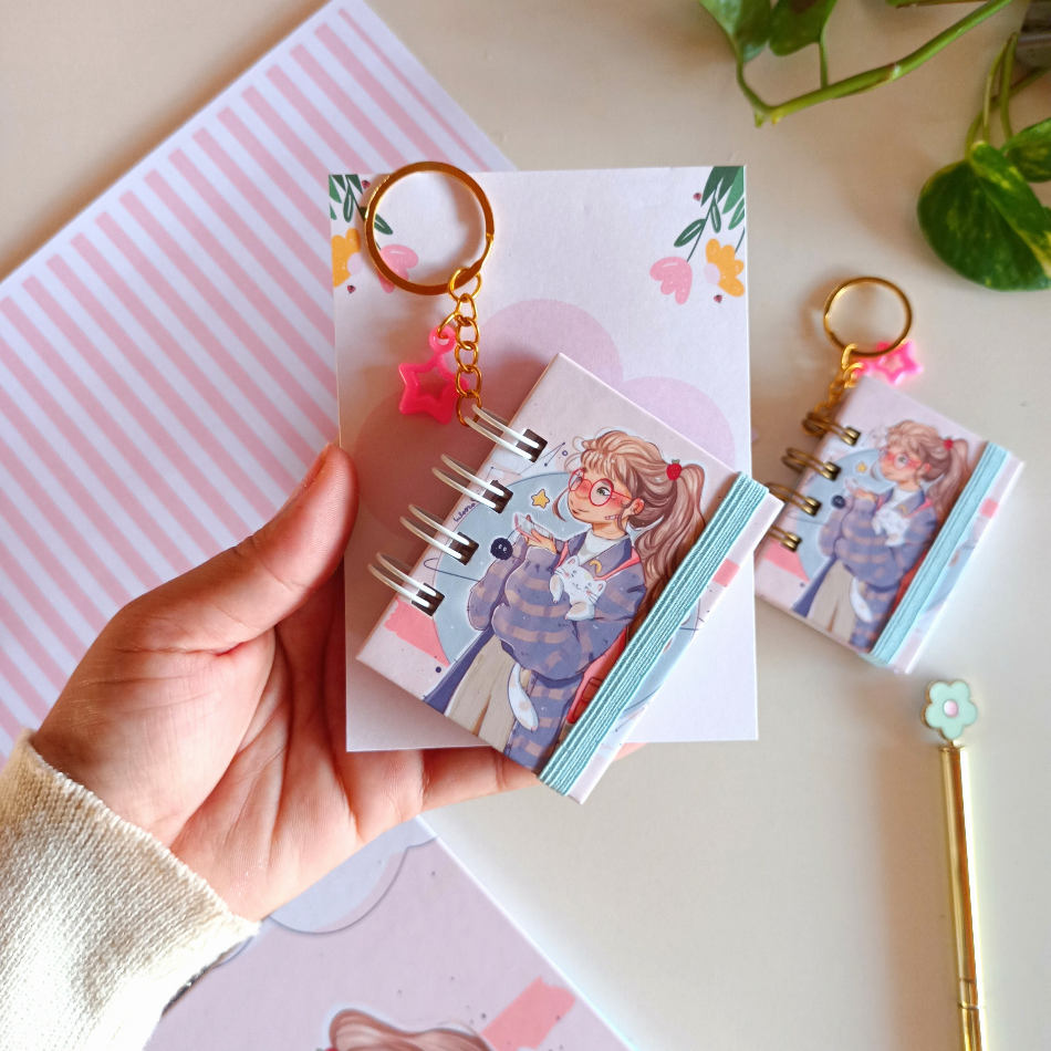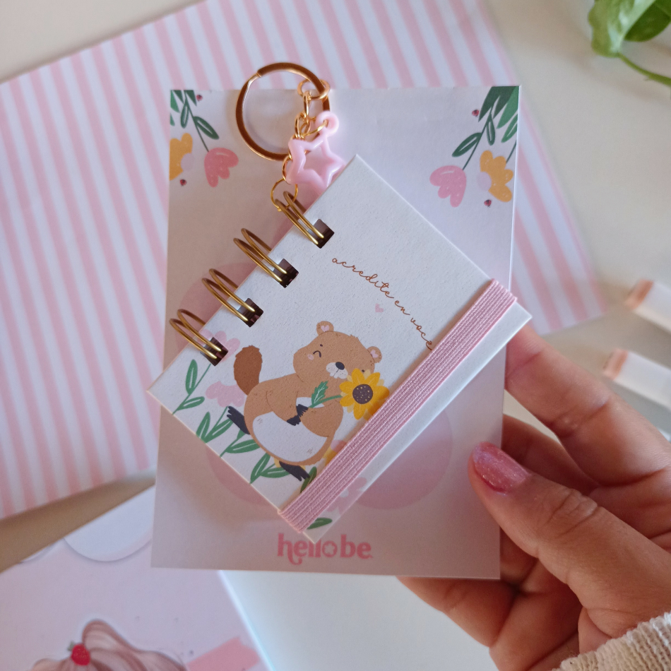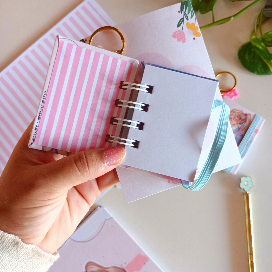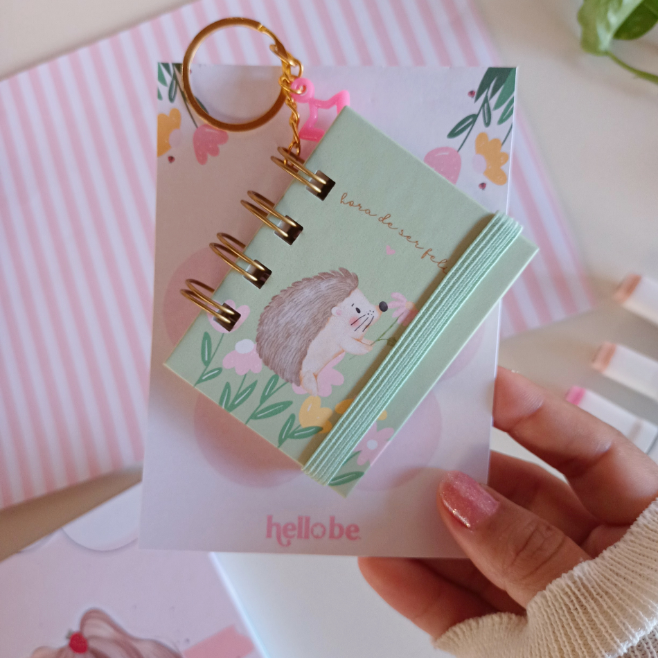 Lindo, fofo e super funcional! Esse chaveiro em formato de mini caderno também serve como um bloquinho de anotações.