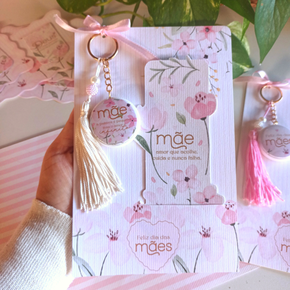 É possível colocar em um dos lados do chaveiro a logo da empresa, igreja… ou colocar o nome da mamãe que receberá.