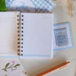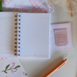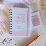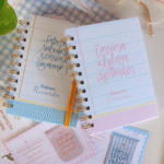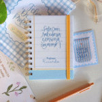 Um bloquinho A6 (11×15 cm) com 60 folhas pautadas e um marcador de páginas magnético.