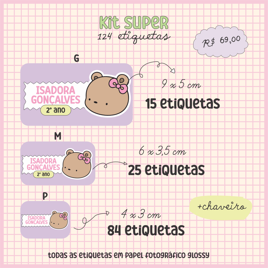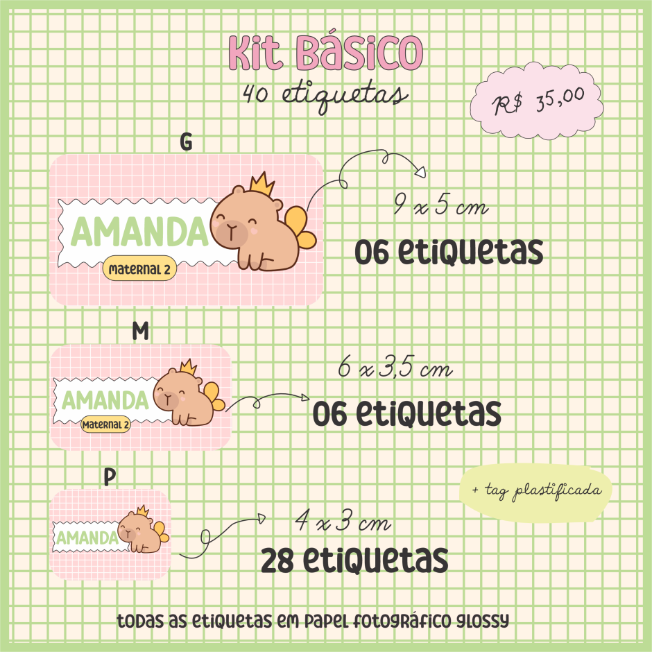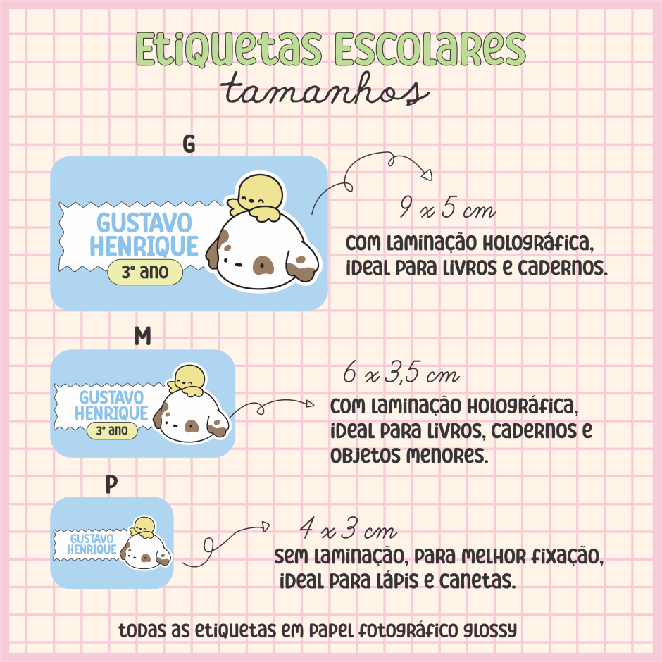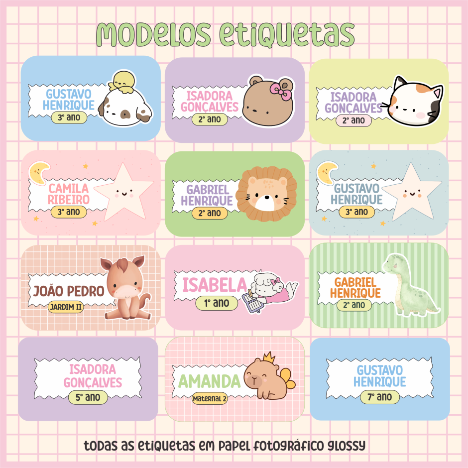 Todas as etiquetas são produzidas em papel fotográfico glossy 115g, garantindo cores vivas e excelente acabamento.